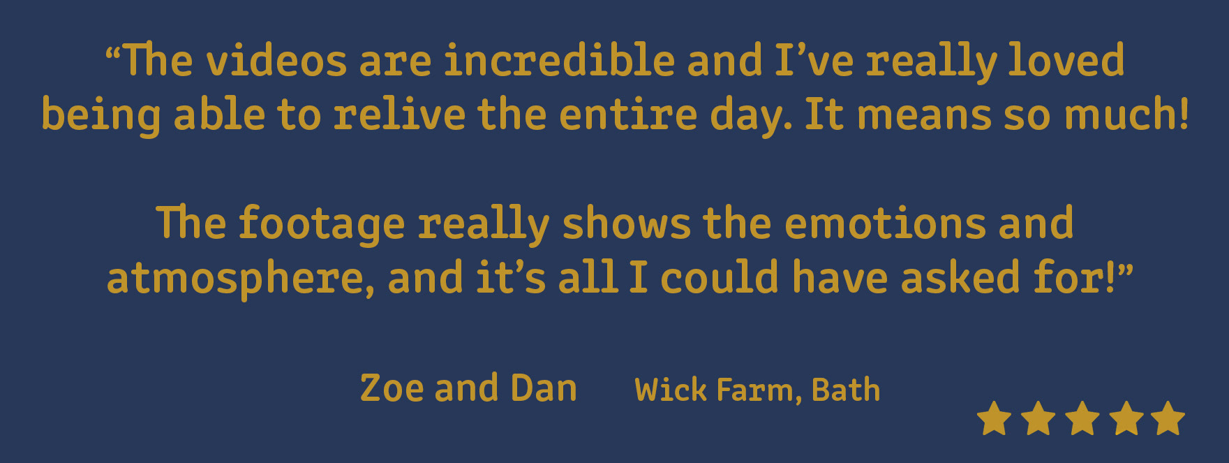 I live in Frome and have since filmed and photographed over 400 weddings in Bath, Wiltshire and Somerset. Most of the weddings I capture come from word of mouth recommendations, with couples really enjoying my friendly and unobtrusive approach on the wedding day, as well as the stunning videos.