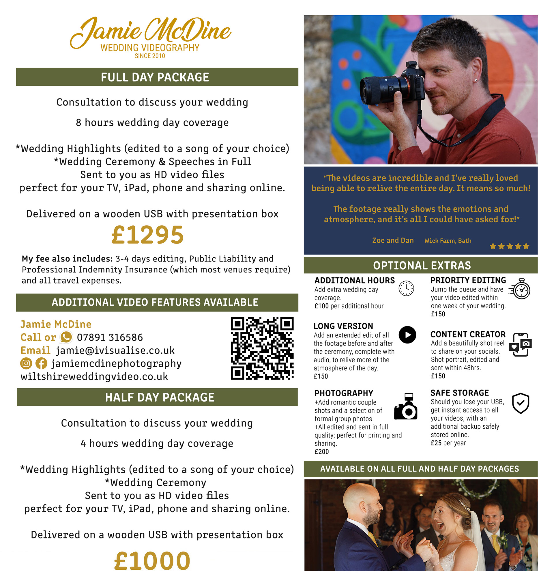 Almost all couples have a full day's coverage, from bridal preparations until first dance, and have the highlights, ceremony and speeches in full. This costs £1295.